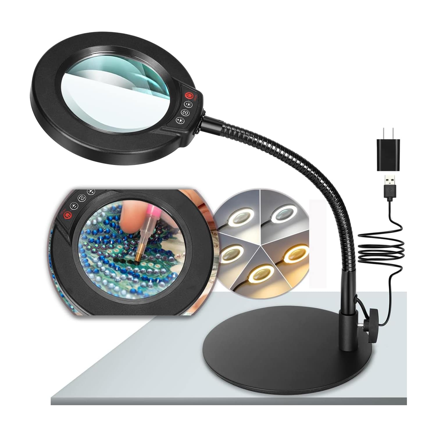 Users will appreciate the premium build quality evident in every component, from the adjustable gooseneck to the flicker-free lighting. It outperforms standard single-color magnifiers with its versatile illumination options.
