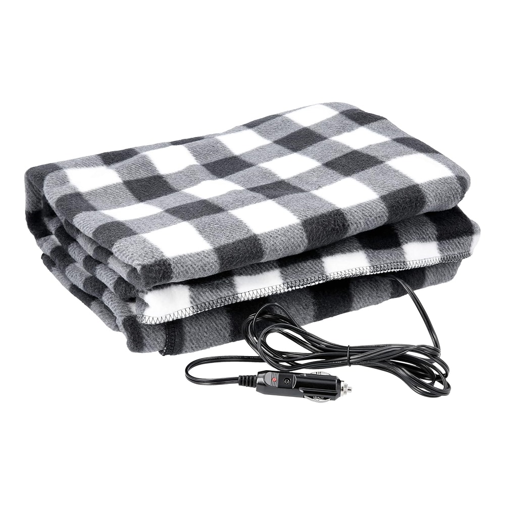 Stalwart positions its heated blanket as the budget-conscious traveler's companion, emphasizing portability and emergency preparedness over advanced features. The black and white plaid polyester fleece design appeals to traditional aesthetics while maintaining functional warmth for basic heating needs during cold weather commutes and outdoor activities like tailgating or camping.